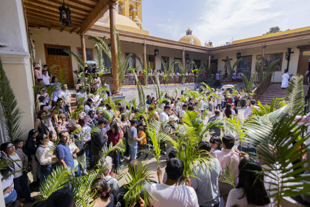 Monseñor Alfredo Vizcarra Mori, S. J., Arzobispo Metropolitano de Trujillo, bendijo las palmas y los ramos de olivo que los fieles agitaban con alegría, cantos y gratitud al Salvador en el patio del arzobispado.