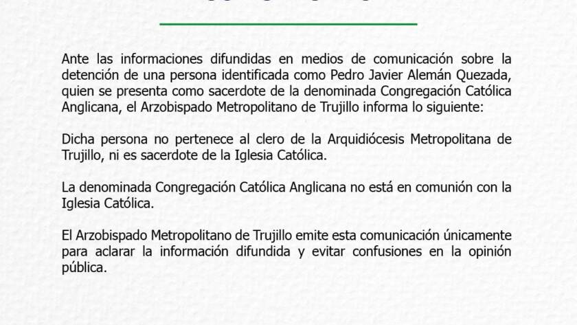 Ante las informaciones difundidas en medios de comunicación sobre la detención de una persona identificada como Pedro Javier Alemán Quezada, quien se presenta como sacerdote de la denominada Congregación Católica Anglicana, el Arzobispado Metropolitano de Trujillo informa lo siguiente: