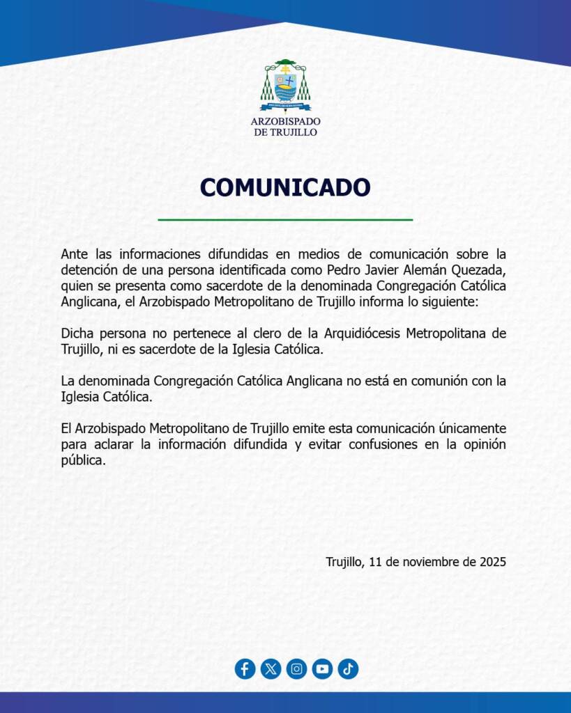 Ante las informaciones difundidas en medios de comunicación sobre la detención de una persona identificada como Pedro Javier Alemán Quezada, quien se presenta como sacerdote de la denominada Congregación Católica Anglicana, el Arzobispado Metropolitano de Trujillo informa lo siguiente: